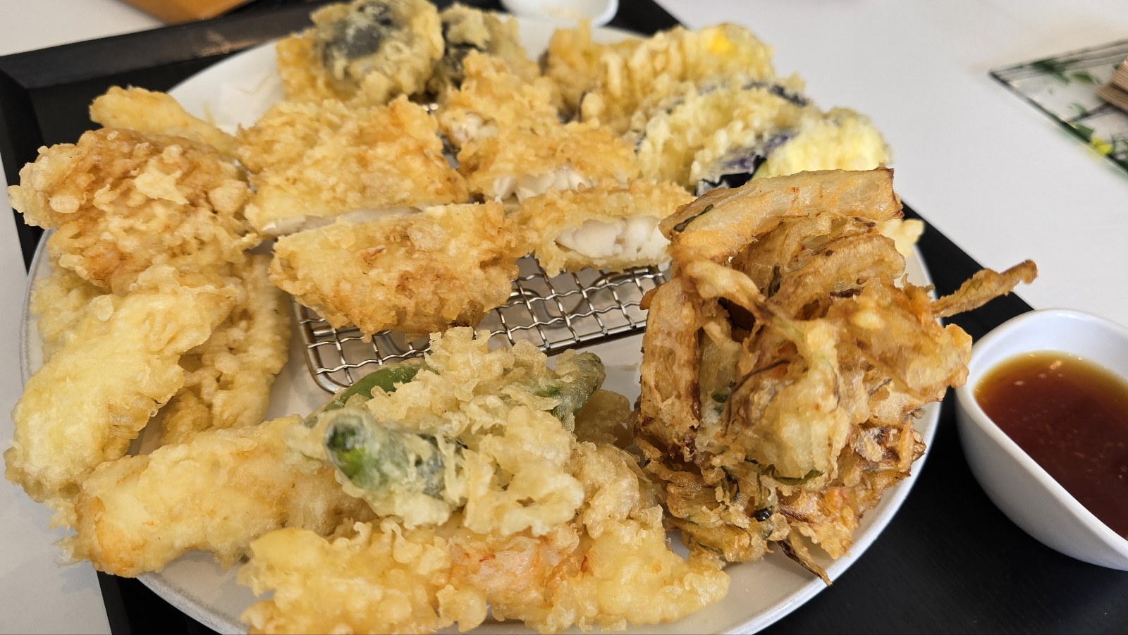 텐푸라 (모둠) 에는 새우, 고구마, 가지, 버섯, 카키아게 등 다양하게 나왔는데, 바삭한 튀김옷이 너무 두껍지 않아서 만족스러웠어요. 우리 아이는 고구마튀김을 특히 잘 먹었어요!